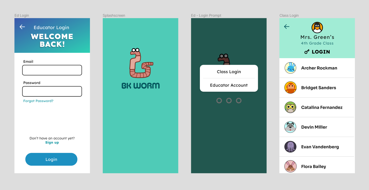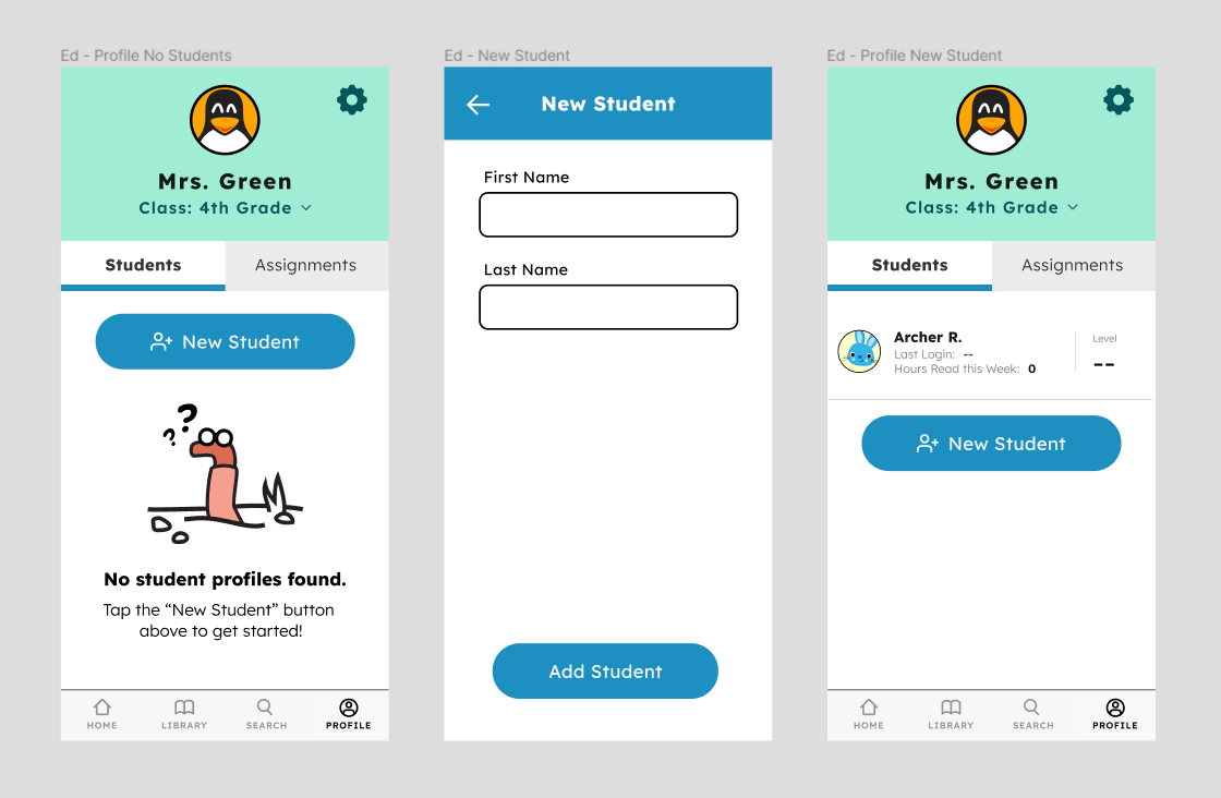 After finishing the first iteration of research and analysis, I created another set of mockups to flesh out the educator view of the app. These screens illustrate how teachers create student profiles to add to their class.