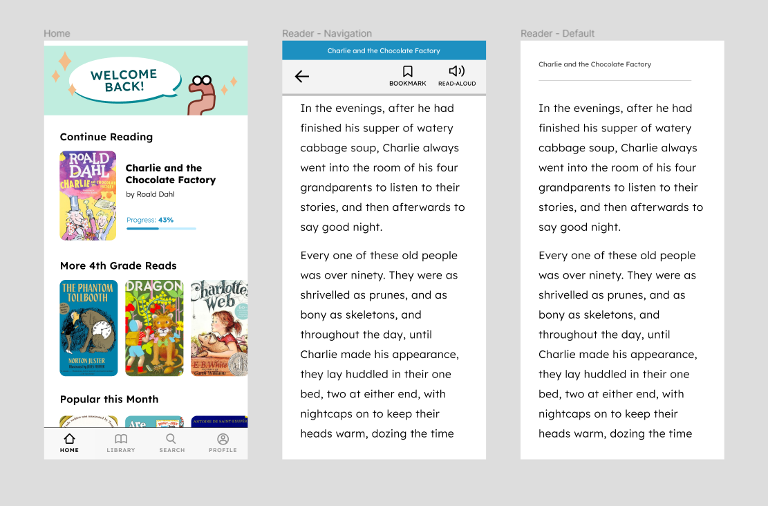 On the eBook reader screens, I simplified the navigation view to reflect what we were able to implement and changed the font to Lexend, a typeface intentionally designed for enhanced character recognition and improved reading performance.