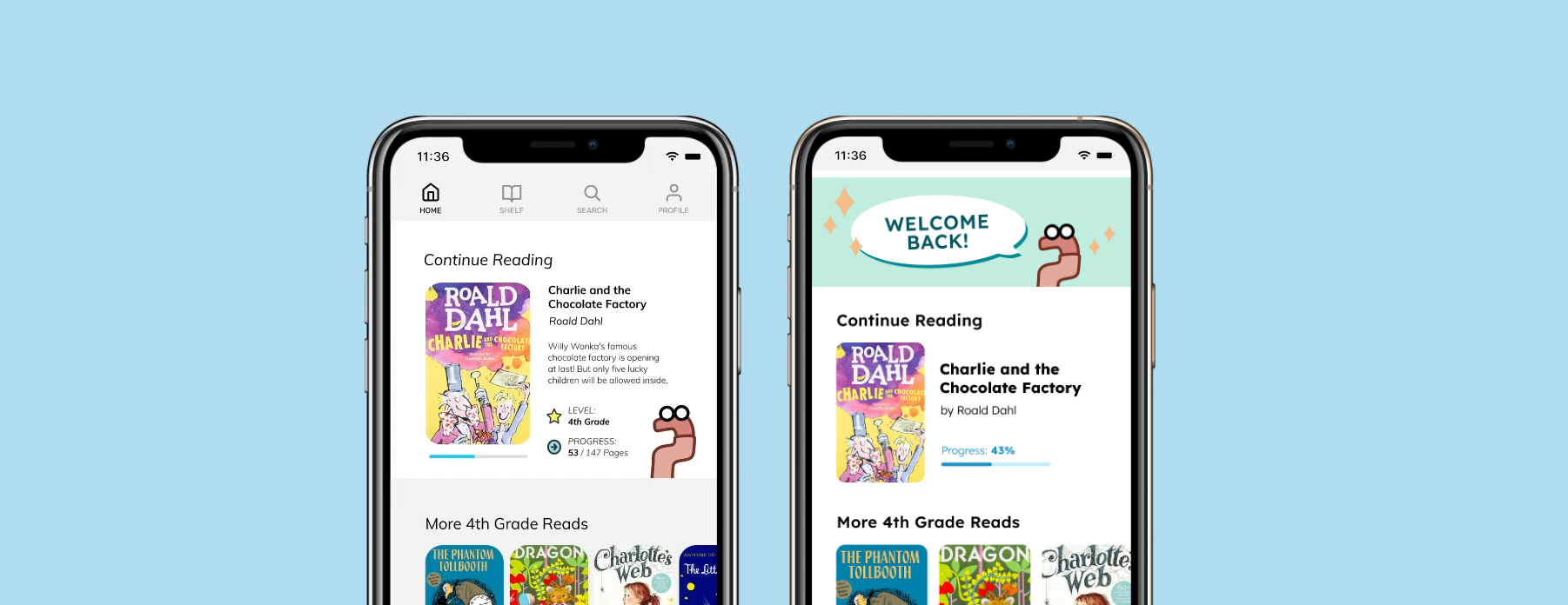 I added a header to break up the monotony of the layout and help give the page a little more warmth and personality. The progress bar on the “Continue Reading” section is more visually intuitive and omits the number of pages to avoid discouraging readers.